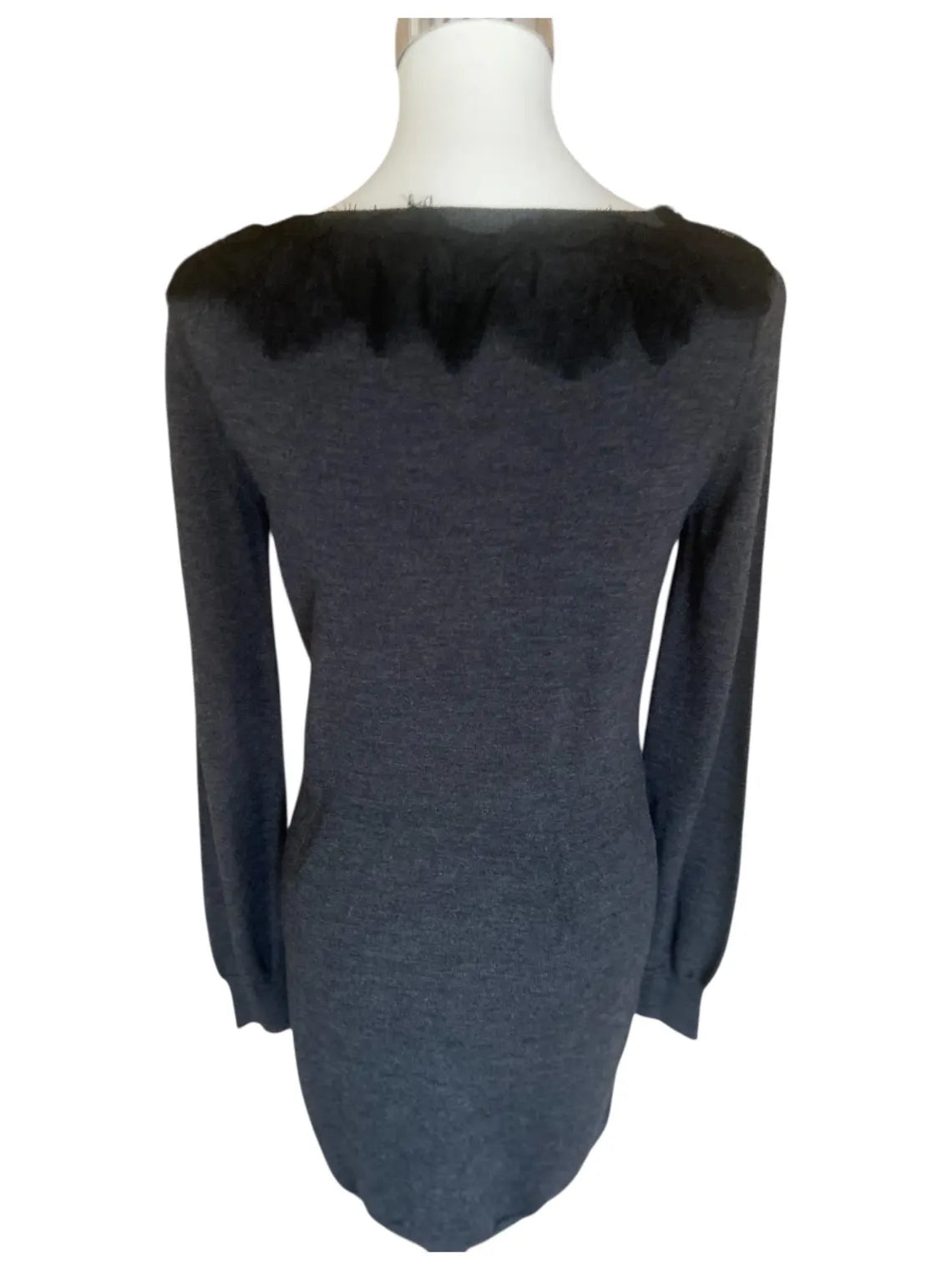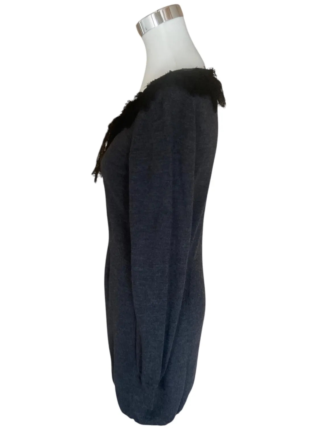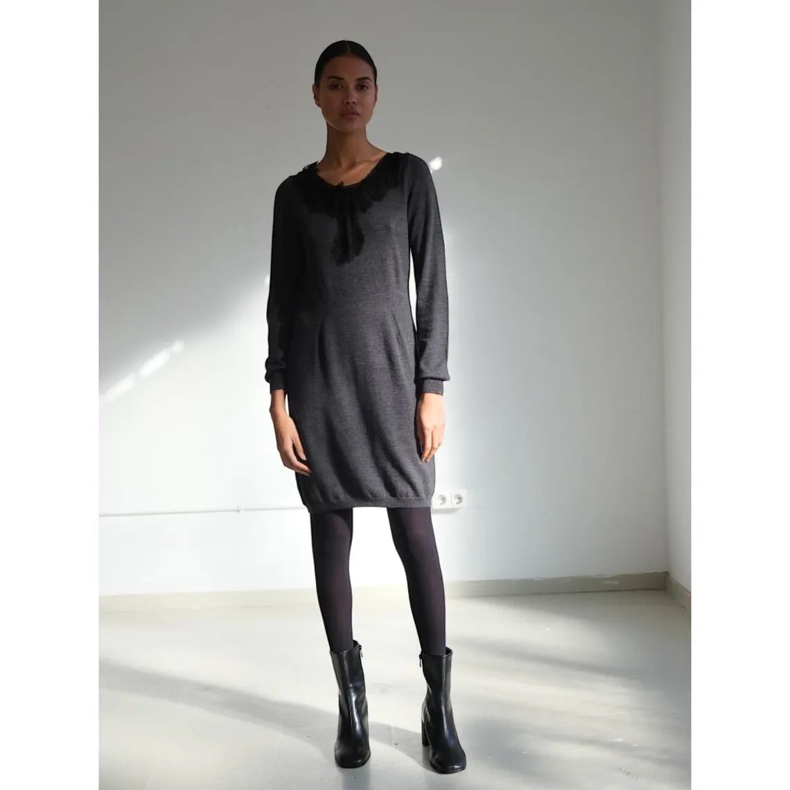 Elegant grey wool dress, midi length, long sleeves and delicate lace bow detail at the neckline, adding a feminine and sophisticated touch. A timeless garment, ideal for both formal looks and everyday outfits with character.