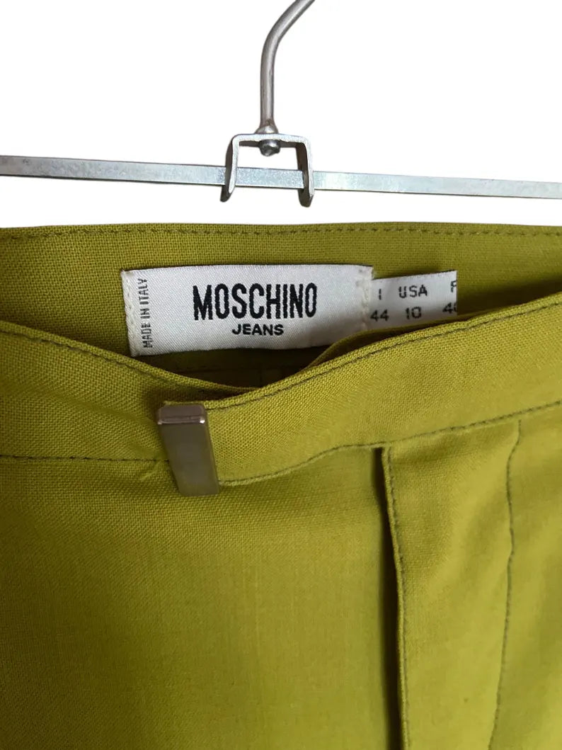 Made in a striking lime green colour, they feature a button fastening and the Moschino logo, adding a distinctive, high-fashion touch.
