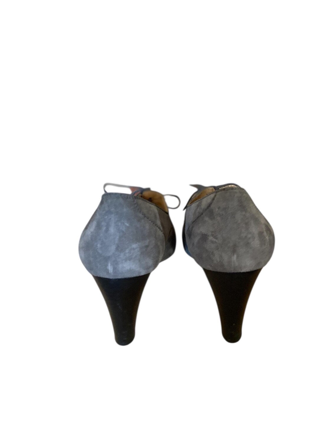 The heel is black, contrasting with the grey suede, and measures 7 cm.